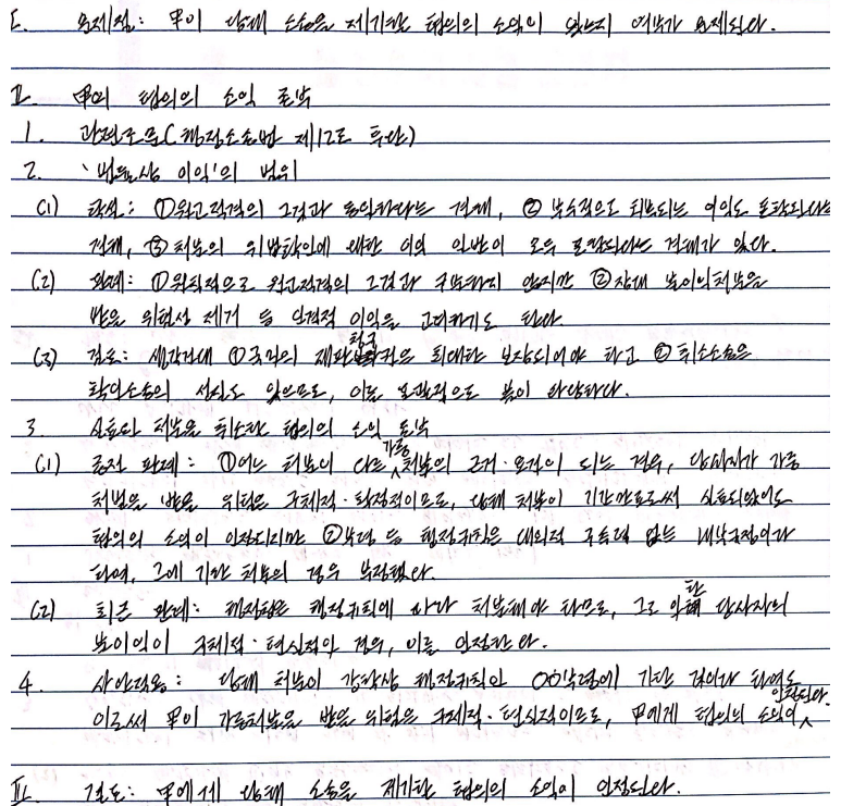 - 일반론을 반드시 쓰는 것이 좋음. 보통 쟁점 자체는 몇 없는데 15-20점이나 배정되는 경우에는 일반론도 써보라는 의미임. 그렇지 않다면 굳이 쓸 필요 없지만 이런 경우에는 위 샘플처럼 아주 깊은 관련성이 있지 않다 하여도 소위 "밑밥"으로 깔고 가는 것이 좋음.