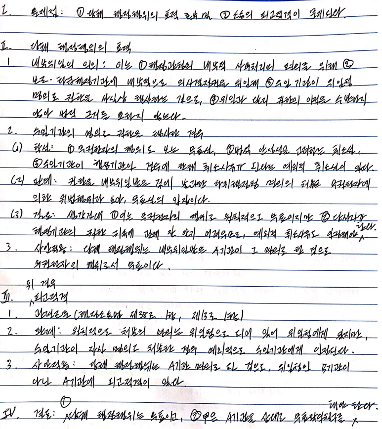- 학설, 검토 및 일반론이 매우 많이 나오는 내용인데 가급적이면 다 쓰는 것이 좋음. 누군가는 다 쓸 것이고 그 사람은 안 쓴 사람보다 더 많은 점수를 가져갈 수밖에 없음. 가끔 판례 없이 일반론과 학설만 써야 되는 문제가 나올 때도 있는데 본시험에서는 이제 나오지 않을 것으로 예상.