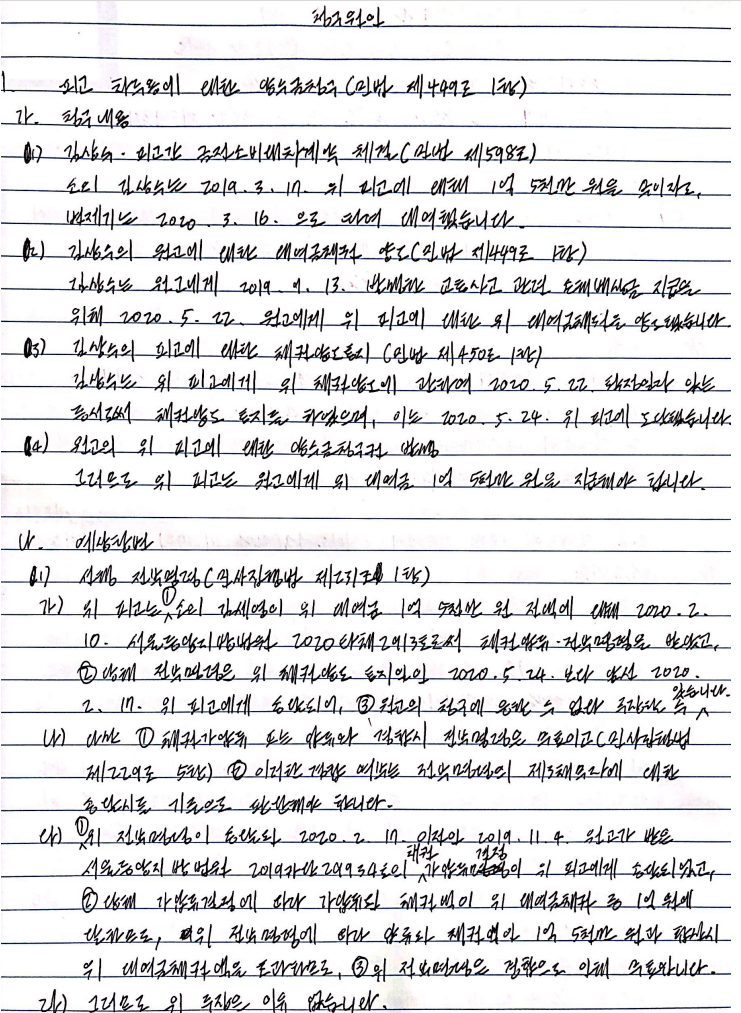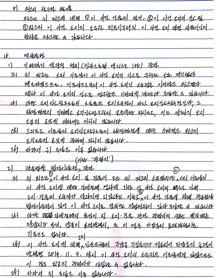 - 전술하였듯, 필자는 청구취지를 작성하지 않고 기록 및 문제지에 의존하여 답안지 세번째 면부터 바로 청구원인을 작성하였음. 이 방법을 사용하겠다면 청구취지 작성 및 마무리를 위하여 최소 30분을 남기고 모든 답안을 작성할 것을 권장함. 가급적 답안지에 줄을 긋는 일은 삼가하여야 하고, 메모에는 온갖 낙서를 해도 좋으니 써야 될 내용의 정리는 메모로 끝내는 연습을 하는 것이 필요함.